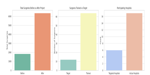 Outcome: A total of 64 rural surgeons received training—far surpassing the original goal of 12. This reflects not only effective outreach but also a keen demand among rural clinicians for advanced surgical skills.