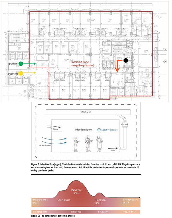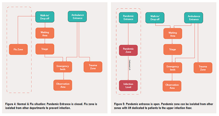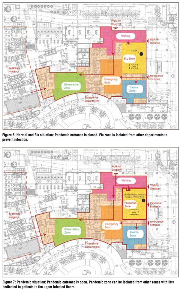 The final design was developed to allow for compartmentalisation into multiple zones which provide isolation and expandability during a mass casualty or pandemic outbreak. The department was designed in such a way to allow for a portion of the emergency department to be isolated for a mass casualty or contagious outbreak, while at the same time allowing for the main emergency department to remain operational. Both the interior of the emergency department as well as the exterior were designed to allow for expansion and compartmentalisation.