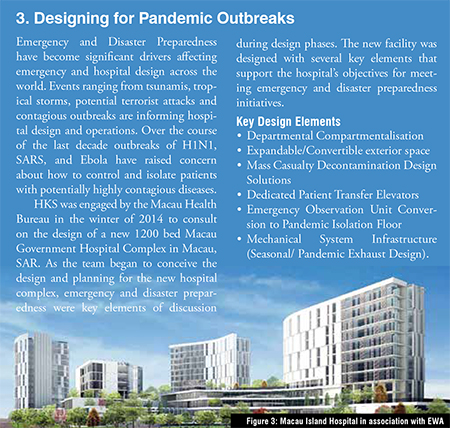 The Emergency department was designed to operate under normal circumstances with 6 key zones including a Fever Clinic, multiple floors with 23-hour emergency observation, Level 1 Trauma/resuscitation rooms, Level 2 and 3 emergency room beds, Level 4 and 5 Fast Track/Triage area and dedicated CT and Radiology Imaging services.