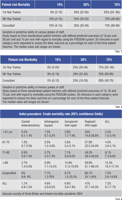 Whereas clinical audit methods tend to concentrate on process and structures, most patients and indeed surgeons are more interested in true outcome. These could fall into three main end points death, complication or survival. Most experienced surgeons and anaesthetists are able—accepting wide confidence limits—to guess the probable mortality outcome from a particular intervention. Interestingly, the ability to predict morbidity often deteriorates with the seniority of the clinician (see Tables 2 and 3). Some specialist societies are now attempting to define outcomes for individual procedures (vascular, colorectal and orthopaedics in particular) to allow comparisons to be made between units. The Vascular Society of Great Britain and Ireland has produced mortality ranges for surgical intervention for abdominal aneurysm and peripheral vascular disease (Table 4). And the Association of Coloproctology for Great Britain and Ireland also produces mortality rates for emergency and elective colon resection and anastomotic leaks rates for anterior resection and other anastomoses (Table 5). In England the Department of Health now publishes Standardised Mortality Ratios (SMR) for 4 procedures (hip and knee replacement, elective and emergency aneurysm).