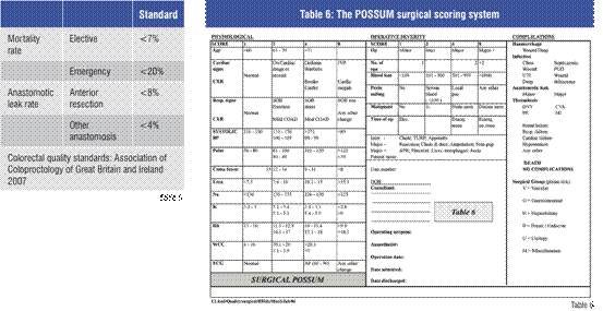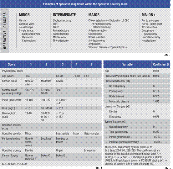 More recently further refinements of the original POSSUM system have been described specifically for colorectal and oesophageal surgeons. Tekkis et al. have described both a CR-POSSUM for colorectal surgeons and an O-POSSUM (Table 9) for oesophagogastric surgeons. These have the advantage of reducing the variables required for prediction and improving the accuracy for these particular fields of surgery. O-POSSUM, is however, somewhat complex and requires knowledge of individual variables, coefficients similar to the APACHE systems. As yet unlike the original POSSUM equations they have not been validated in units outside the UK but the original estimation data set was obtained from many differing sites across the UK, and as the variables and weightings are similar to the original POSSUM scoring system, it is likely that their accuracy will be confirmed by other observers. However, all these adaptations, unlike the original POSSUM system, have as yet no morbidity predictive model and cross speciality comparison is, of course, not possible.