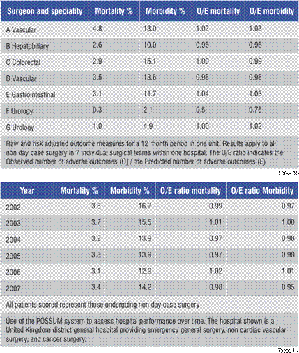 Methods that assess individual patient variables would appear to offer the best methodology for assessing surgeon and anaesthetist performance. Table 10 illustrates the marked differences in outcome of surgeons with varying case mix. However, with the application of the POSSUM system it is possible to predict the expected number of deaths and comparing this with the actual number yields a ratio (the observed to expected ratio; O/E ratio) which potentially produces a true quality measure (see Table 10 and 11). There is now commercially available software (the CRAB system: available from CRAB Clinical Informatics Ltd) which includes all available POSSUM algorithms and which allows for the first time analysis of all POSSUM related quality indicators from audit aid to surgeon, unit and specialty specific outcome measures.